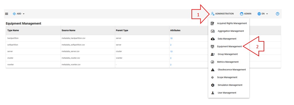 In the example from the screenshot above, the new equipment type is cluster (its parent is the equipment type "vcenter") and its attributes are :